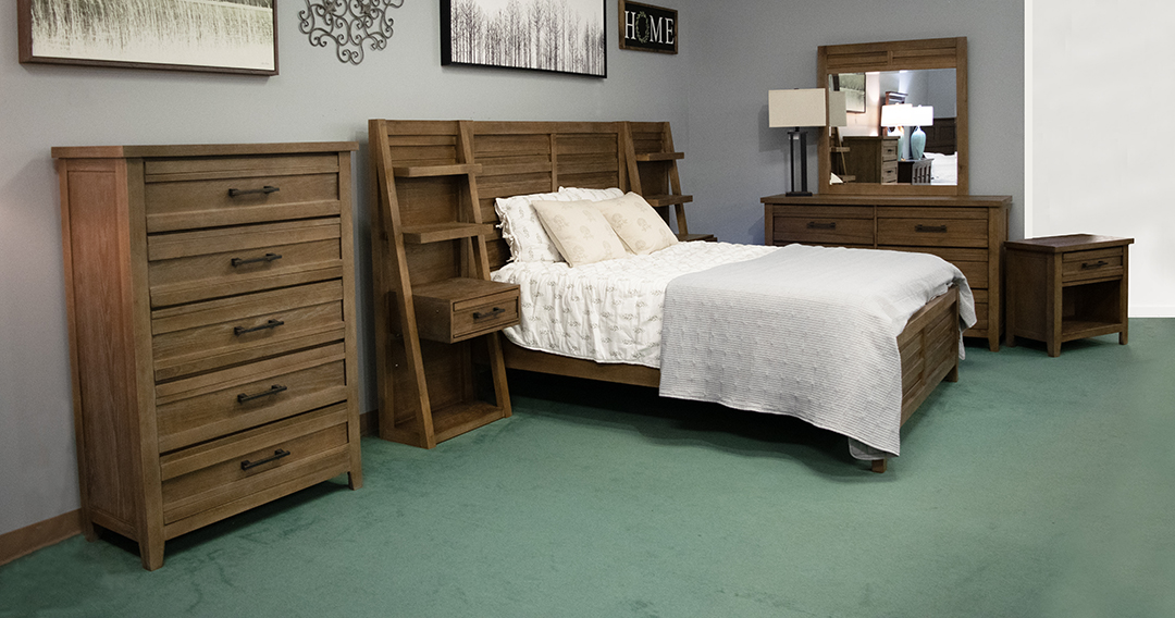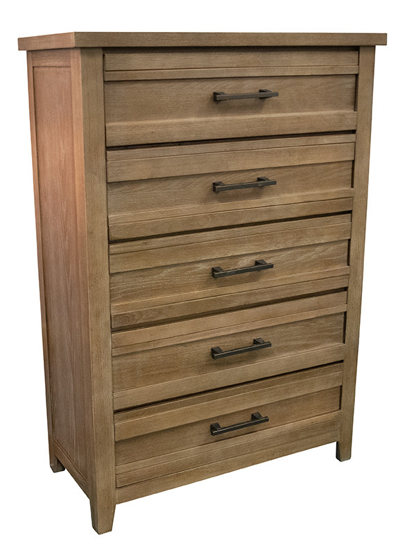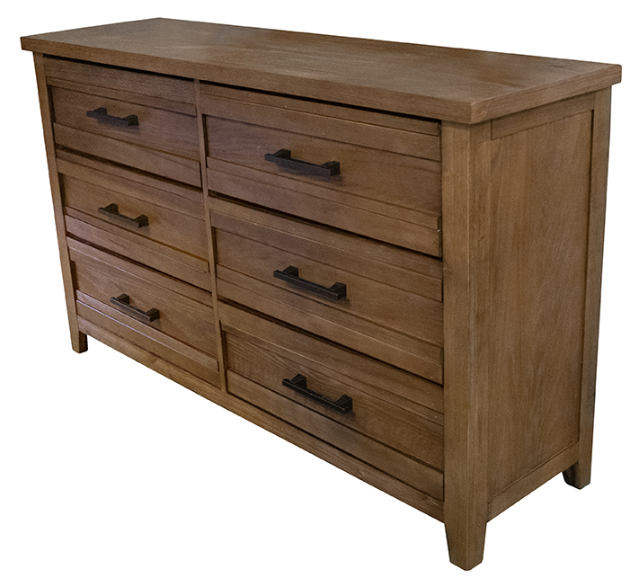 Create a cozy atmosphere with the Veranda Oak bedroom collection. This rustic group leaves it all to the details with its stacked wood pattern, black hardware, and felt lined top drawers. This group is finished in a stunning Oak that is sure to warm up and compliment your space.