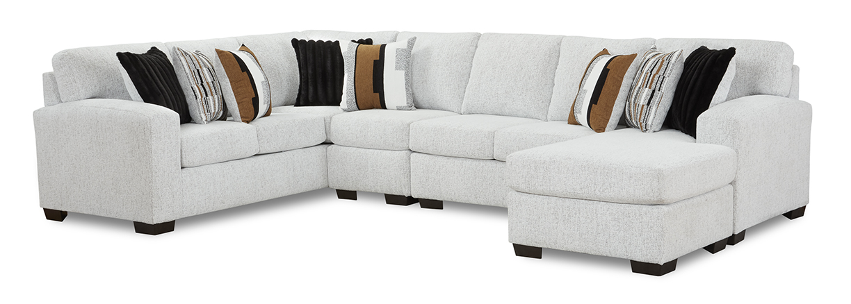 The Skylar Arctic Sectional offers a contemporary frame upholstered in a soft, plush material. The group is paired with three accent upholsteries ranging in texture and pattern to further compliment the aesthetic. The set offers an armless chair that can be inserted between the LAF and RAF pieces to expand the seating area if needed. If comfort and style are what you are looking for, the Skylar Arctic is the perfect option!