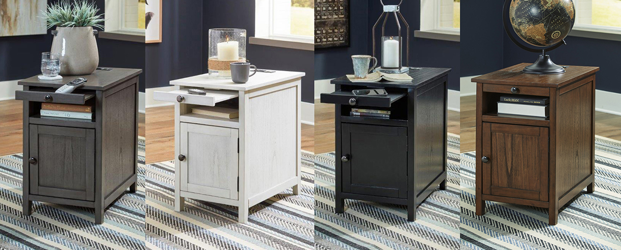 Add big character to a small space with the Claypool chairside end table. With its compact size and strong silhouette, it can go anywhere and blend easily into the decor. Less is so much more with the Shaker-inspired design and teal wood tone finish. Loaded with form and function, this end table displays accent pieces and stores essentials securely while keeping devices powered up.