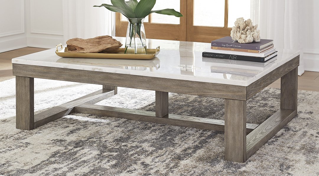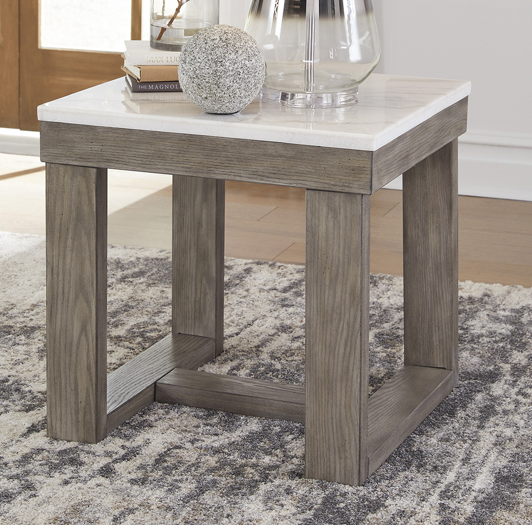 - Table bases are finished with a trend-right grayish brown wood-tone.